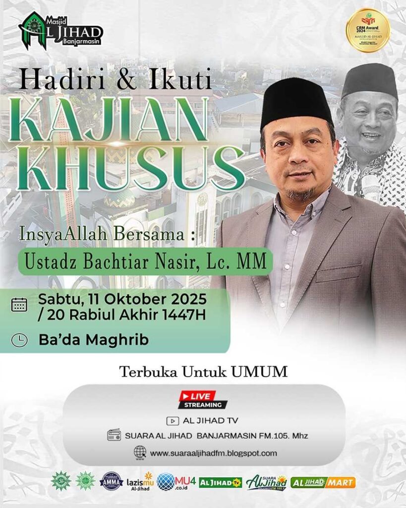 Banjarmasin, mu4.co.id – Ustaz Bachtiar Nasir (UBN) akan kembali hadir di kota Banjarmasin dan mengisi kajian Islami di Masjid Al Jihad pada Sabtu, 11 Oktober 2025 malam Ahad.