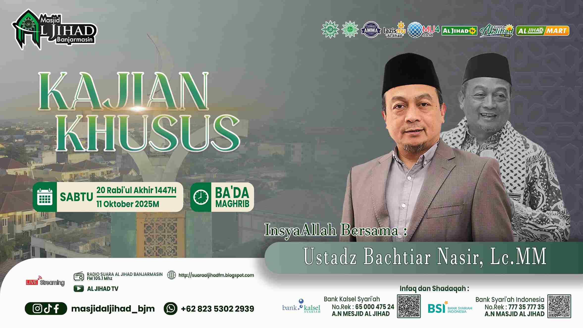 Banjarmasin, mu4.co.id – Ustaz Bachtiar Nasir (UBN) akan kembali hadir di kota Banjarmasin dan mengisi kajian Islami di Masjid Al Jihad pada Sabtu, 11 Oktober 2025 malam Ahad.