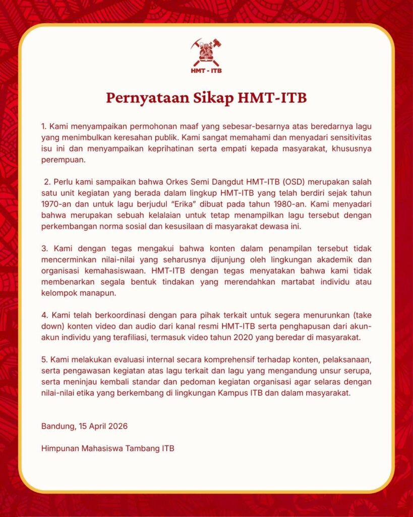 “Menyampaikan permohonan maaf yang sebesar-besarnya atas beredarnya lagu yang menimbulkan keresahan publik. Kami sangat memahami dan menyadari sensitivitas isu ini dan menyampaikan keprihatinan serta empati kepada masyarakat, khususnya perempuan,” mengutip pernyataan Hima Tambang ITB di laman ITB, Kamis (16/4).