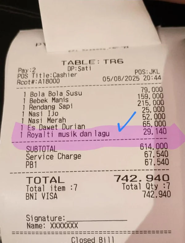 Jakarta, mu4.co.id – Sebuah foto struk restoran viral di media sosial karena mencantumkan biaya tak biasa, yakni royalti musik dan lagu sebesar Rp29.140.