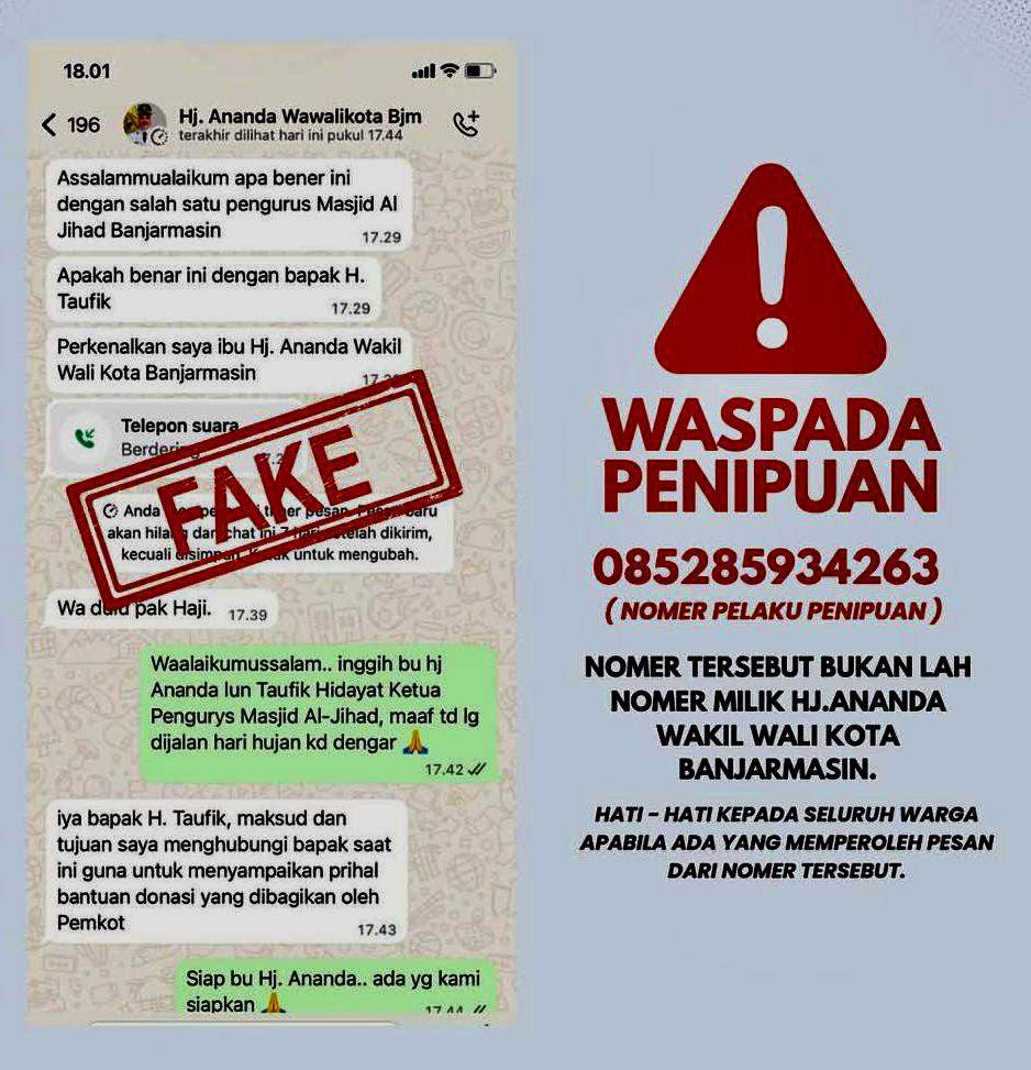 Seperti yang baru-baru ini di alami oleh Ketua Takmir Masjid Al Jihad Banjarmasin, H Taufik Hidayat. Ia menceritakan pada Sabtu (27/9) pukul 17.29 Wita, menerima pesan WhatsApp dari nomor 0852-8593-4263 diponselnya yang mengaku dari Wakil Wali Kota Banjarmasin, Hj Ananda.