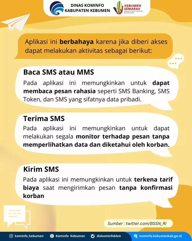 File tersebut merupakan aplikasi berbahaya yang bisa menyadap data pribadi (Pin ATM, KTP, nomor rekening, tempat tinggal, dll), OTP (One Time Password) mobile banking, atau bahkan mengendalikan ponsel Anda dari jauh JIKA diunduh/download.